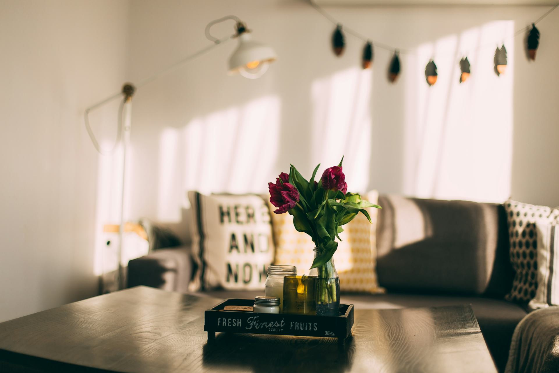 Brug lamper med varmt lys i rum, hvor du ønsker hygge og afslapning, og koldere lys i arbejdsområder. På den måde kan du understøtte stemningen og få de neutrale farver til at fremstå mere levende.